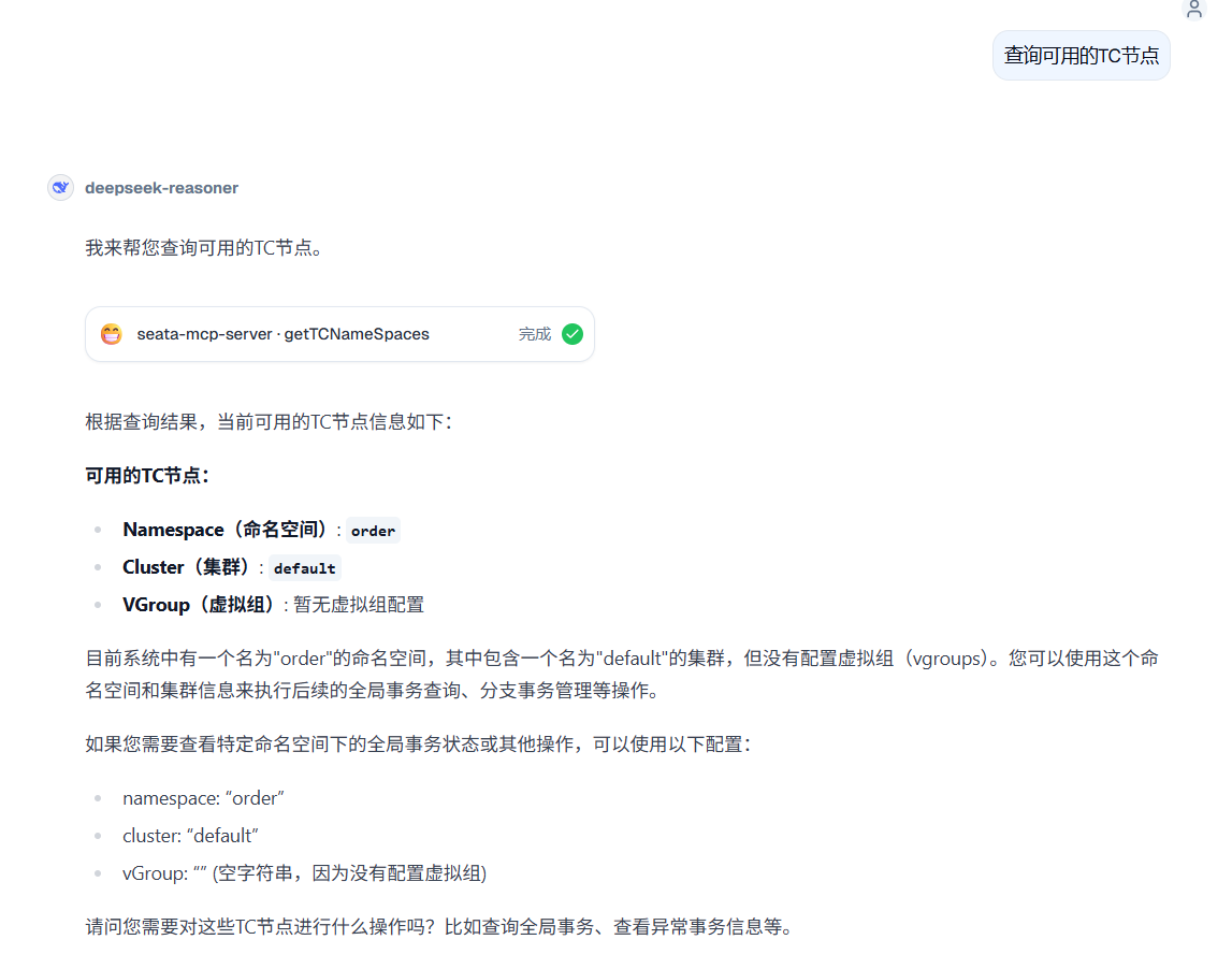 • 通过Seata NamingServer的TC节点注册发现功能,使得MCP Server可以请求NamingServer的namespace接口获取可用TC节点信息